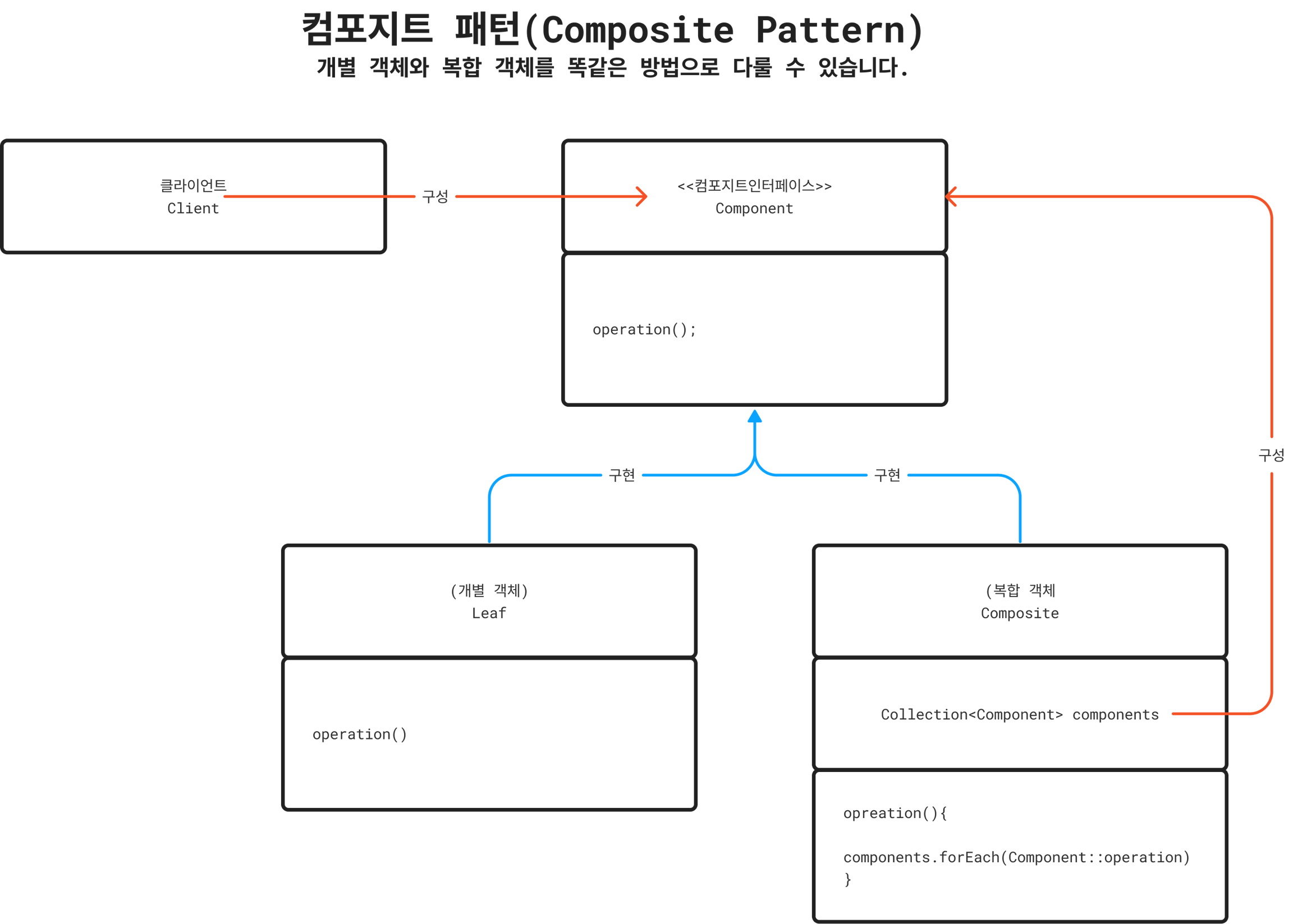 ์ปดํฌ์งํธ ํจํด์ ์ฌ์ฉํ๋ฉด ๊ฐ์ฒด์ ๊ตฌ์ฑ๊ณผ ๊ฐ๋ณ ๊ฐ์ฒด๋ฅผ ๋ ธ๋๋ก ๊ฐ์ง๋ ํธ๋ฆฌ ํํ์ ๊ฐ์ฒด ๊ตฌ์กฐ๋ฅผ ๋ง๋ค ์ ์์ต๋๋ค.