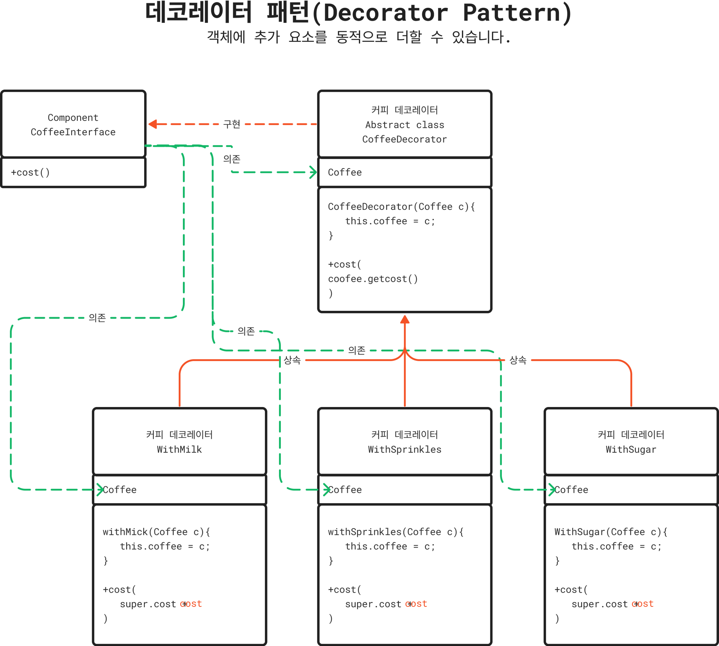 ๋ฐ์ฝ๋ ์ดํฐ๋ฅผ ์ฌ์ฉํ๋ฉด ์๋ธํด๋์ค๋ฅผ ๋ง๋ค ๋๋ณด๋ค ํ ์ฌ ์ ์ฐํ๊ฒ ๊ธฐ๋ฅ์ ํ์ํ ์ ์์ต๋๋ค.